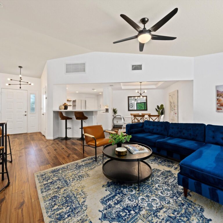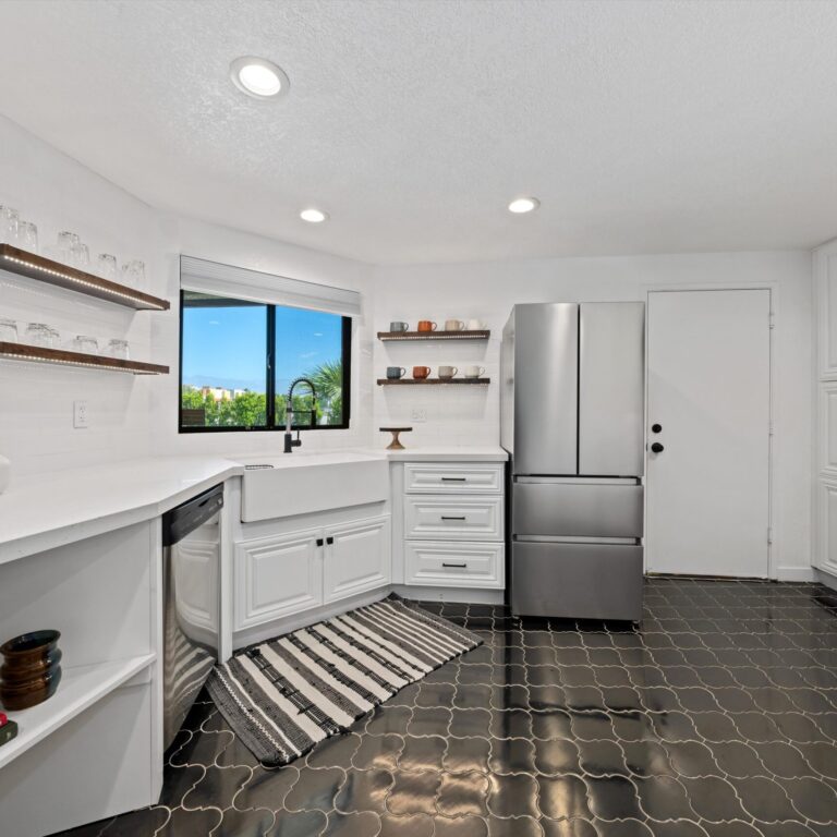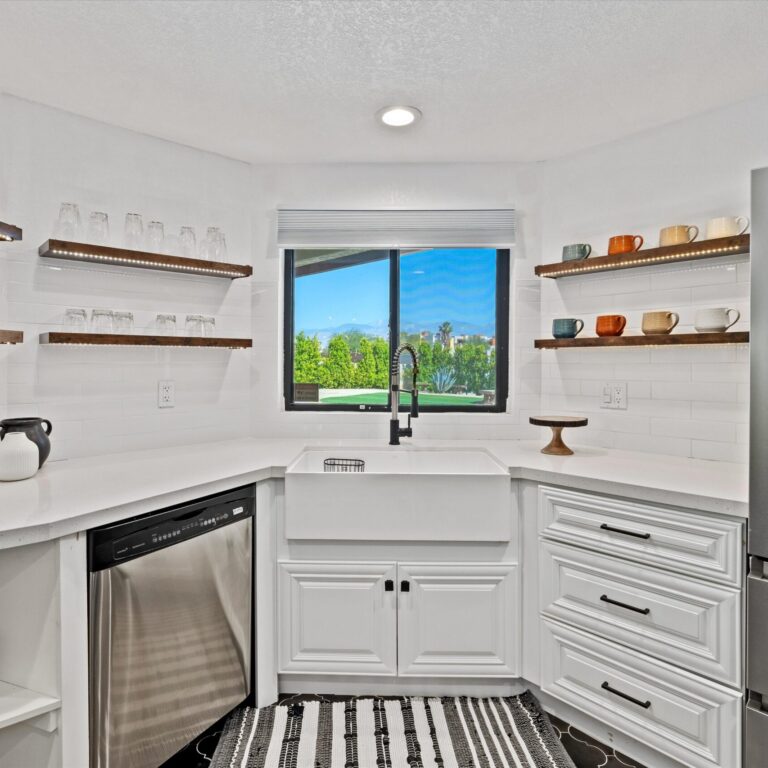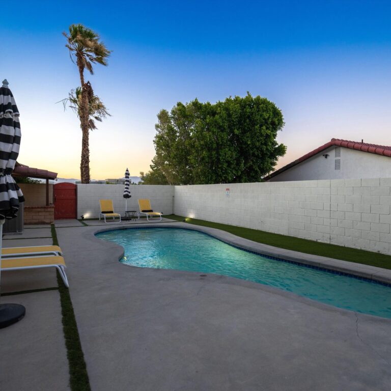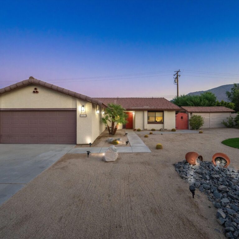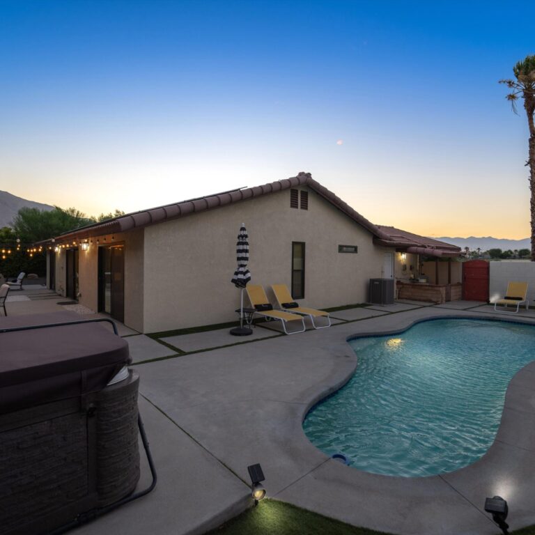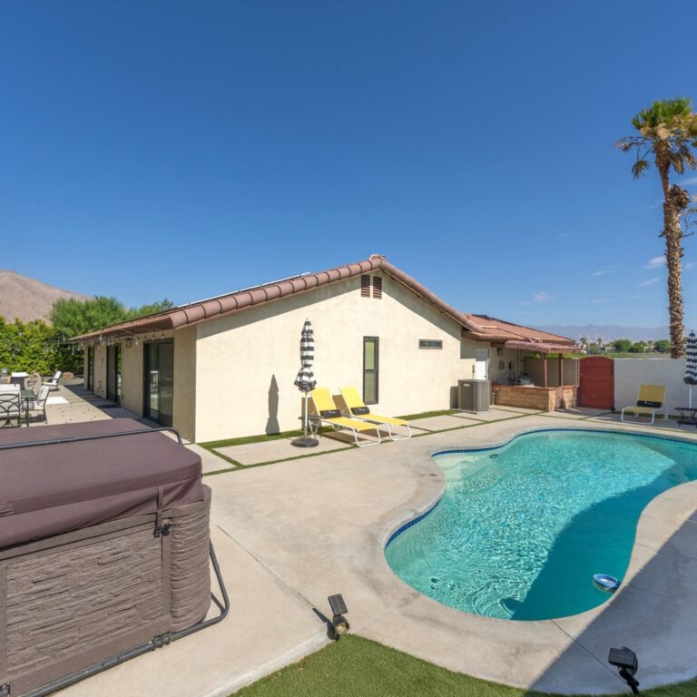 Imagine escaping to your own private oasis in the desert, where the warm sun meets the tranquil ambiance of your welcoming home. This move-in ready property sits on a large lot, providing ample space to relax in style. The private backyard features a sparkling pool, perfect for cooling off on hot desert days, a spa, and plenty of entertaining space. As you step inside, you’ll be greeted by a beautifully designed interior, complete with modern amenities and sleek finishes. The recently redone stunning kitchen features stainless steel appliances, gorgeous tile floor, recessed lights, modern open shelving and quartz countertops. A wine fridge by the bar counter makes the open floor plan ideal for gatherings. Unwind in the spacious primary bedroom that has a gorgeous en-suite bathroom, walk-in custom closet and easy access to the pool area. Two additional guest bedrooms are generous in size and share a remodeled bathroom. A stunning front yard with privacy hedges has many options for entertaining. A large two car garage with a convenient direct entry and storage shed in the yard completed this home. Ideally located near shops and restaurants, you will have an abundance of dining options and entertainment. Great potential for short term rentals with proven history available upon request. No HOA and no land lease. Owned solar panels and electrical car charger. Whether you’re looking to entertain, relax, or simply call the desert your own, this incredible home has everything you need to live your best desert life.